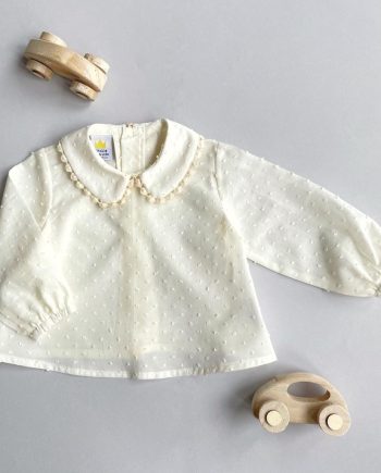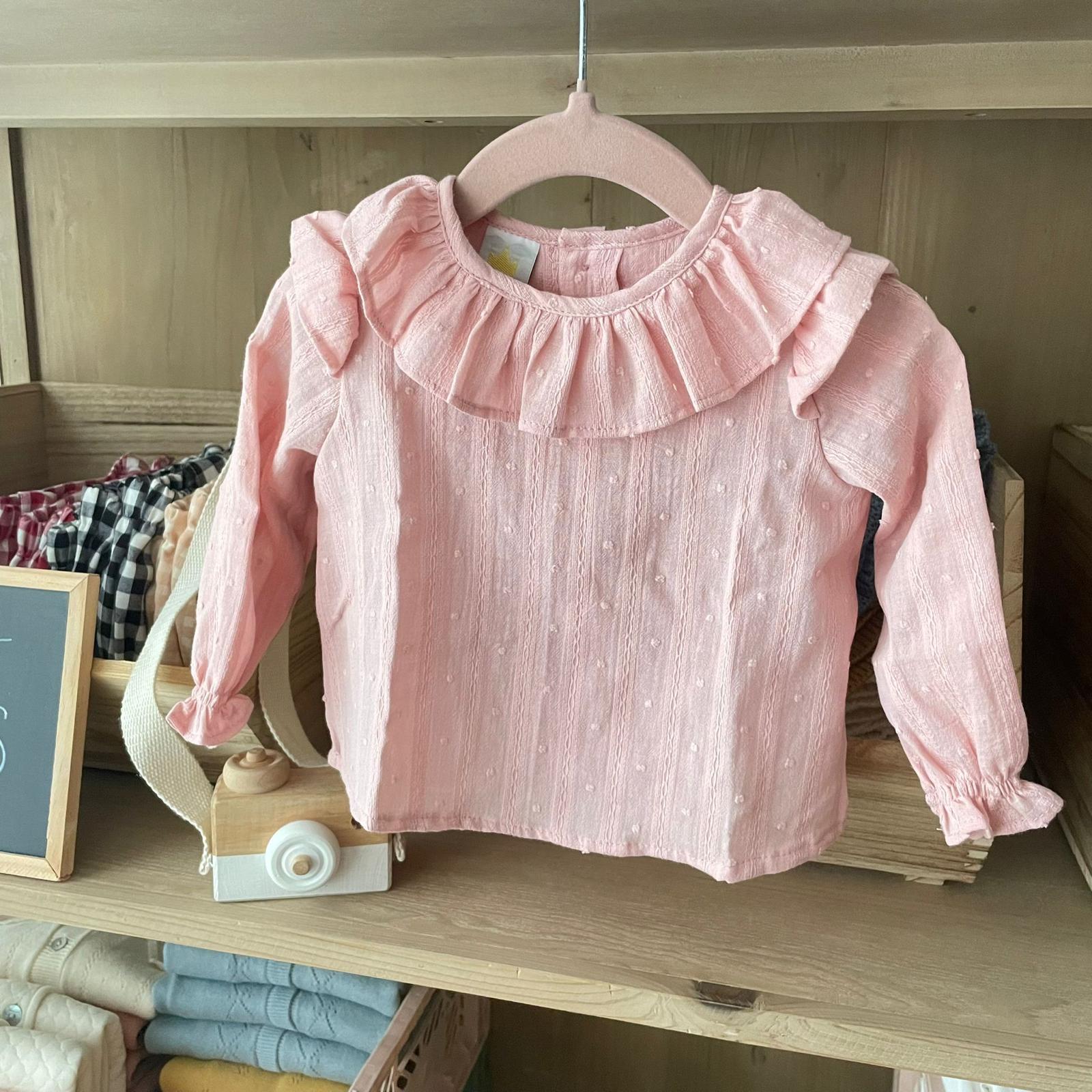 Blusa plumeti guirnalda rosa confeccionada en plumeti con pequeño bordado en color rosa con volante en el cuello y con hilo goma en los puños, apertura total trasera de la blusa y abotonada con botones nácar. Una prenda ideal para lucir esta temporada, con muchas posibilidades de combinar con cualquiera de nuestras prendas (tanto ranitas, como culottes).