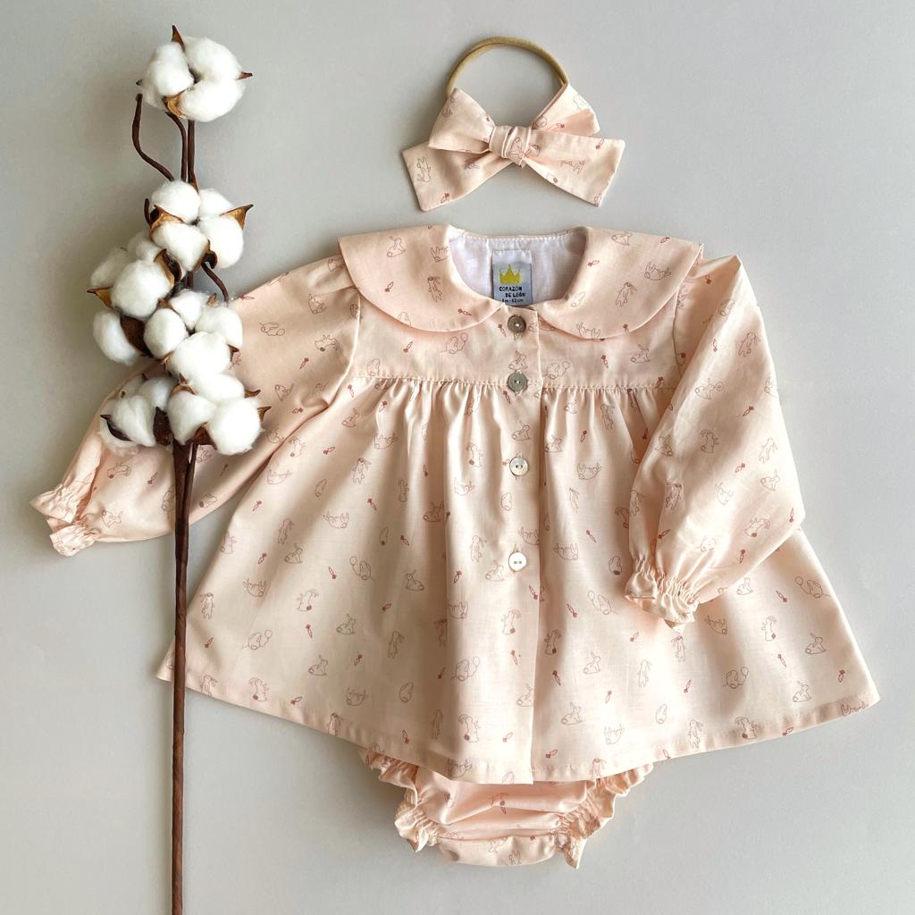 Jesusito pink rabbit confeccionada en tejido rosa clarito con divertido estampado de conejitos, apertura total delantera abotonada con botones nácar. Hilo goma en puños, manga fruncida en hombros y cuello en una pieza. Incluido el cubrepañal en el precio. Una prenda ideal para lucir esta temporada, con muchas posibilidades de combinar con cualquiera de nuestras prendas (tanto chaquetillas como calcetines altos).