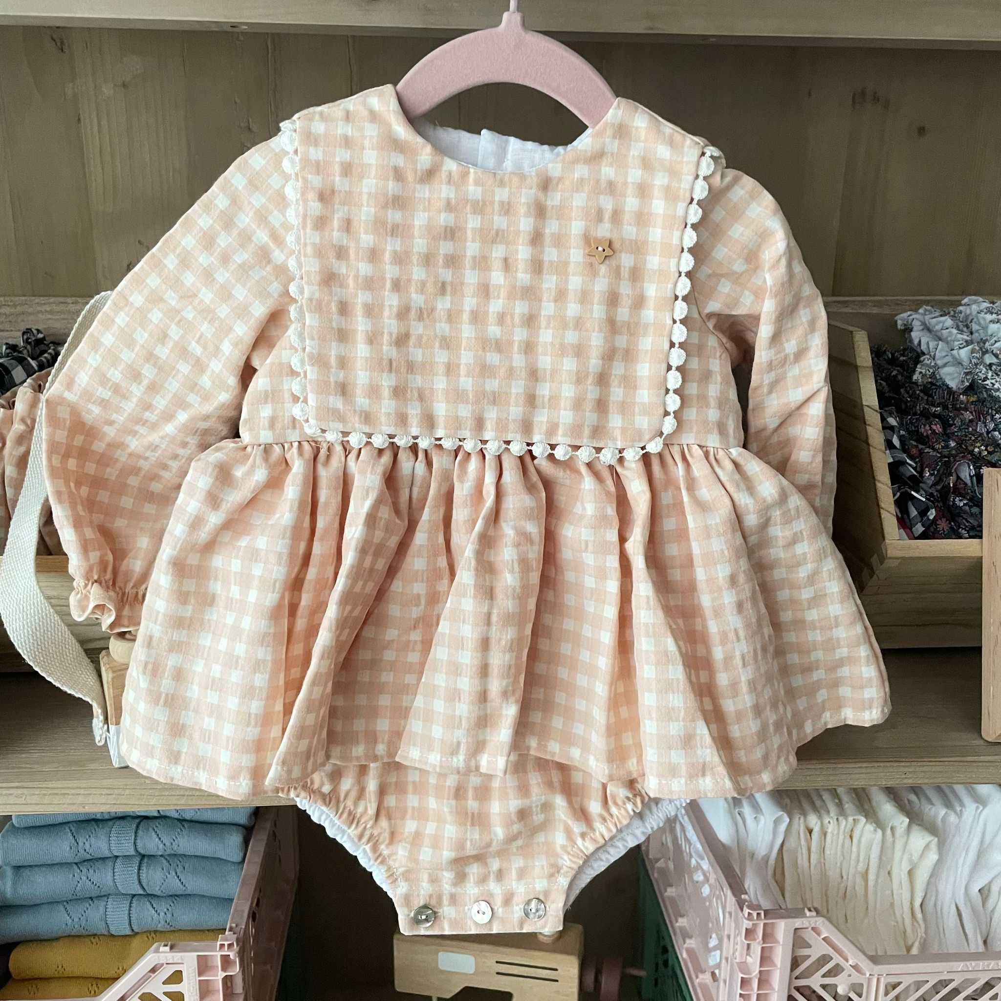 Ranita vichy melocotón, confeccionada en precioso estampado vichy melocotón sobre fondo crudo, con apertura en el trasero, con mangas largas y con abotonadura en el bajo.